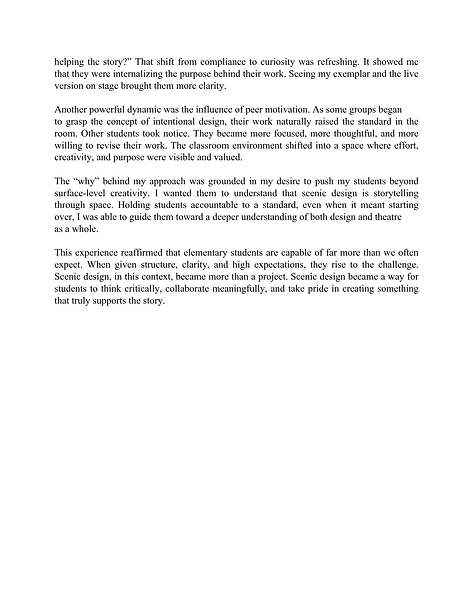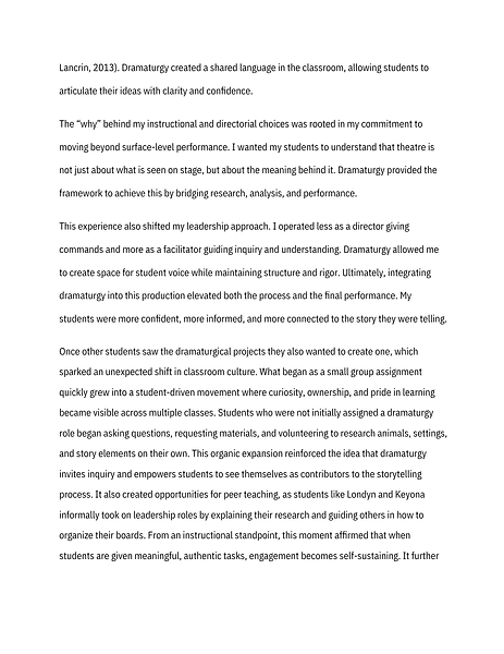 Student voice and ownership are central to my approach. Through projects like dramaturgy boards and research presentations, students become active contributors to the storytelling process. These experiences build confidence, deepen understanding, and foster collaboration.